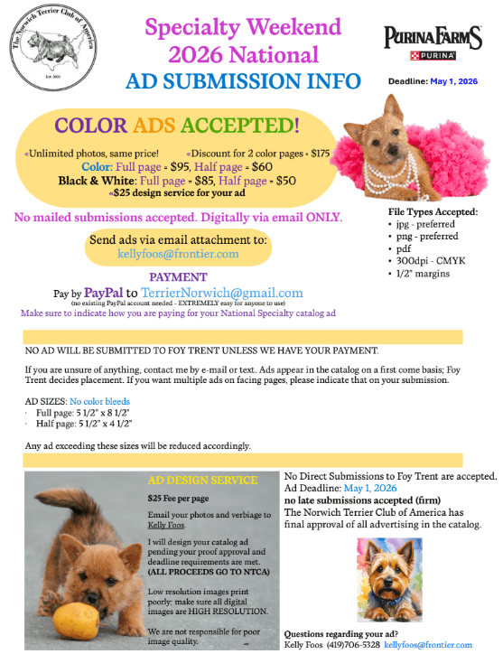 How to Submit an Ad for the 2026 National Specialty Catalog! Amanda Kozora2026-04-01T22:43:42-04:00April 1st, 2026| Share This... FacebookXRedditLinkedInTumblrPinterestEmail Related Posts Annual Awards Dinner April 1st, 2026 Upcoming Supported Entries/Affiliated Club Specialties March 12th, 2025 2025 Trophy Fundraising March 10th, 2025