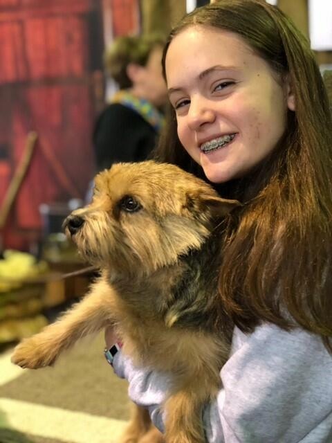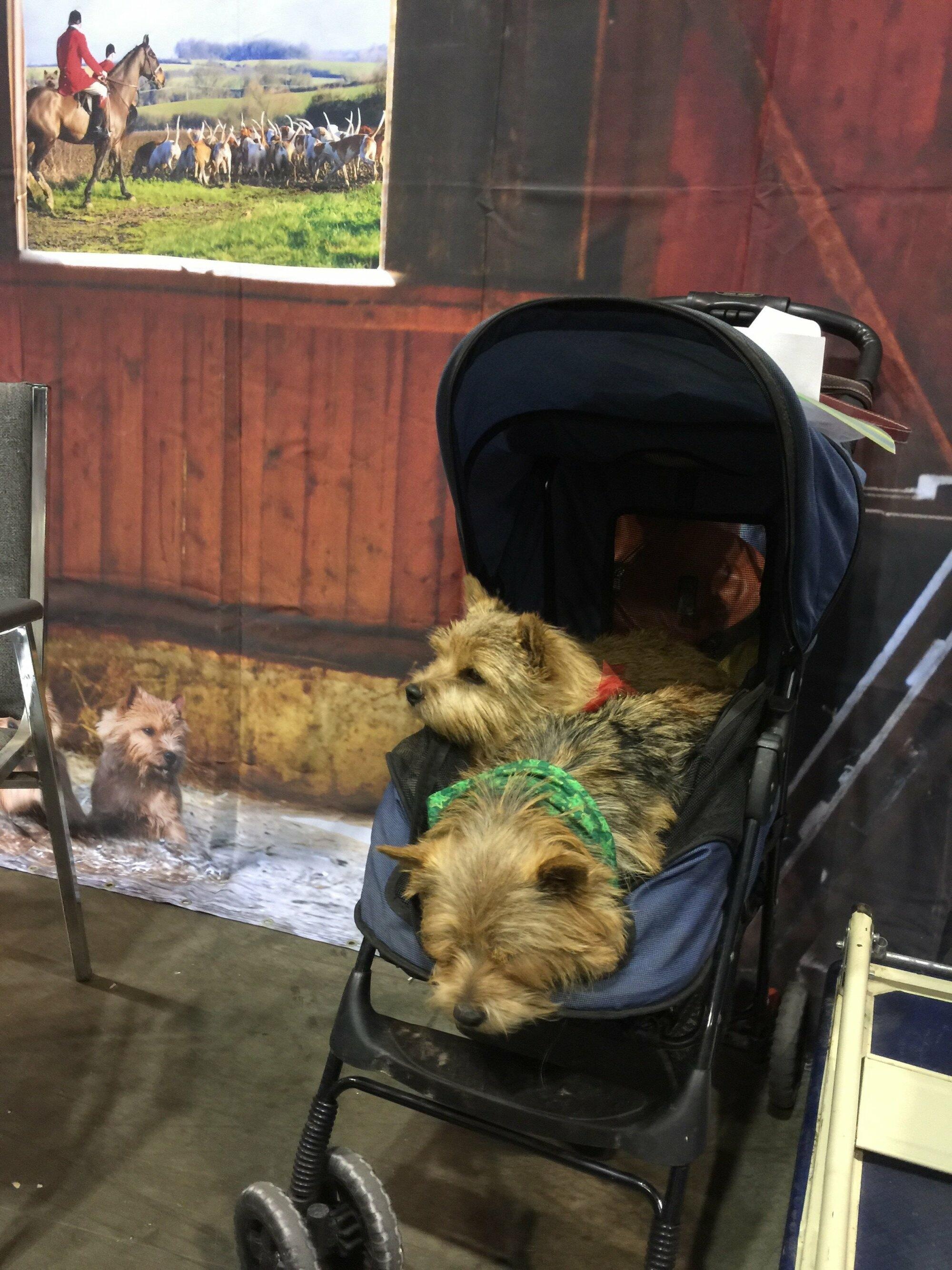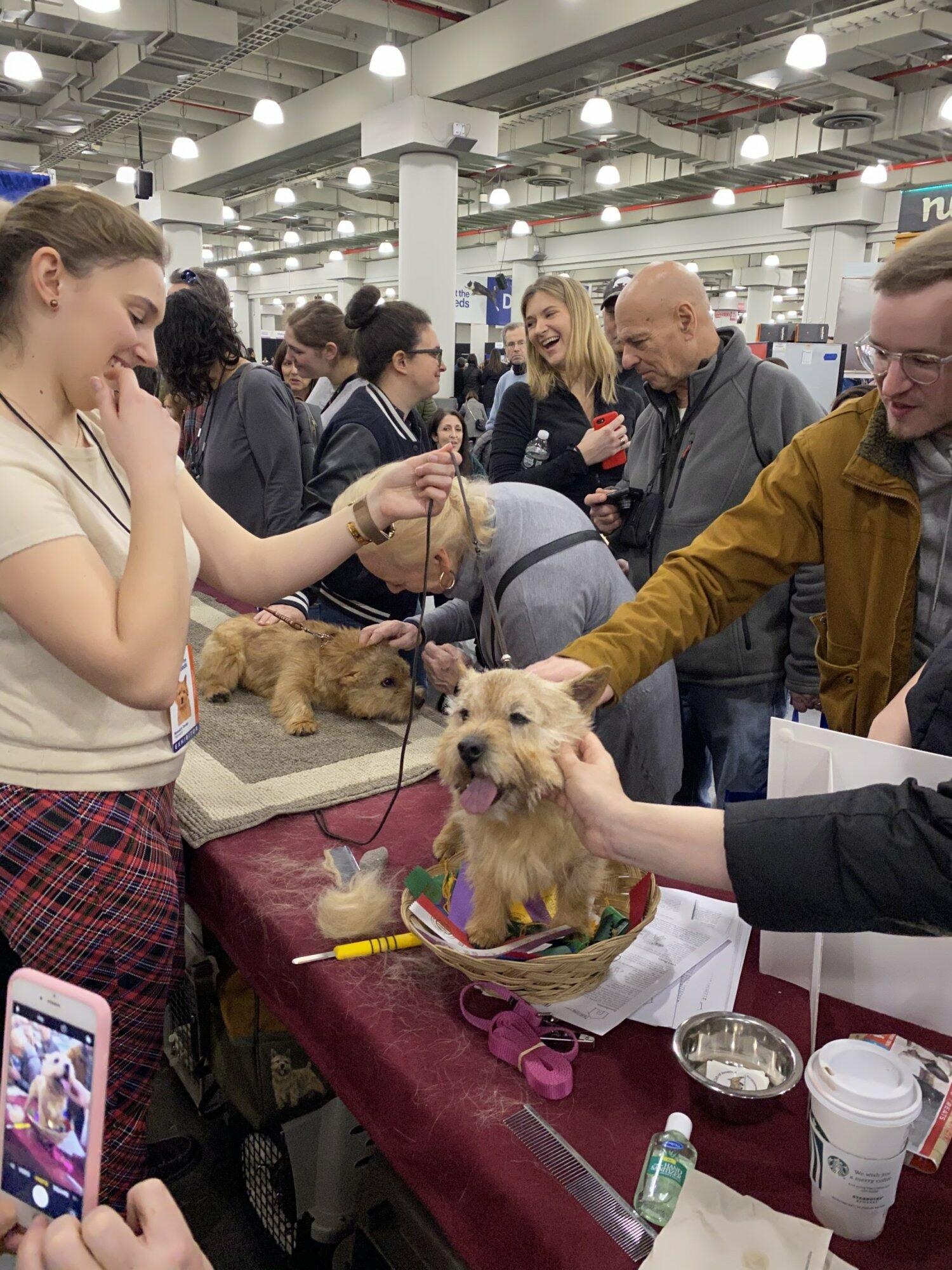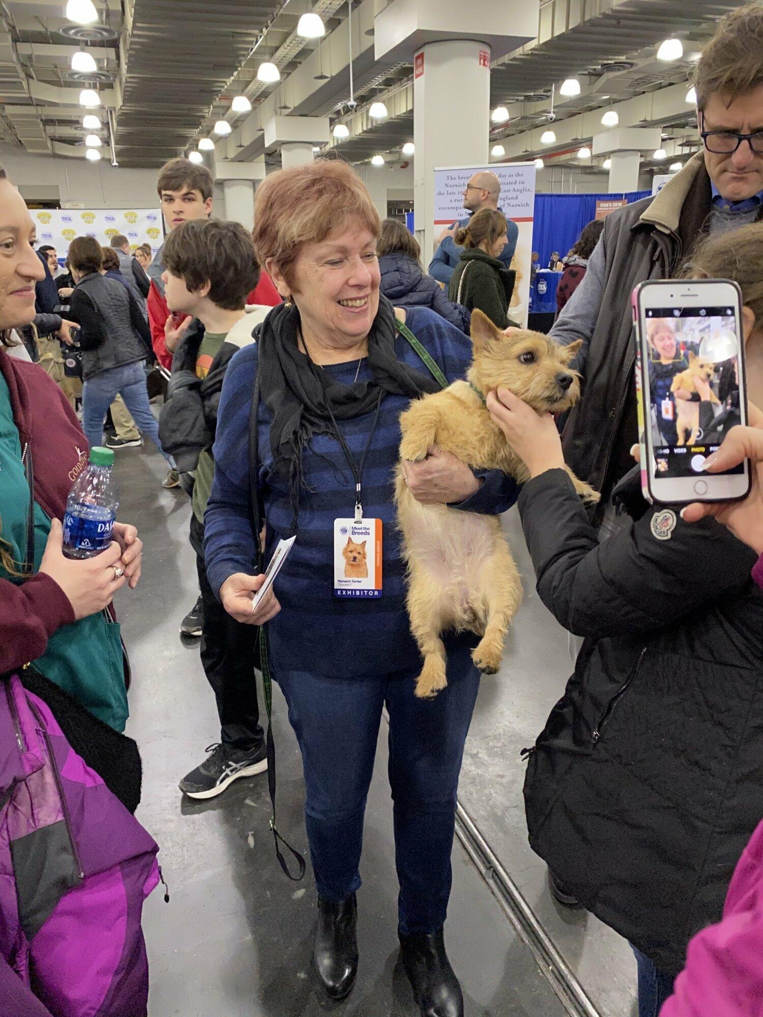 Once again, we had a wonderful turn out of Club members and the public for our Meet the Breeds booth in New York City, one of the events which is part of the Westminster Kennel Club show weekend. The weather was surprisingly warm, and the AKC allotted a larger booth near the front of Pier 92, which gave us more room for man and beast. Thanks go to Nicky Conroy and Judy Laffey for their hard work to set-up and take down the booth décor, and for manning the booth all day with their Norwich ambassadors Breeze, Mr. Finn and Riley. Thanks also to Richard Giotta who joined us with Hugo, and to Dina Moore-Tzouris who provided some background props to make our “barn” more authentic. My dogs Ernie and Steffi joined in the fun