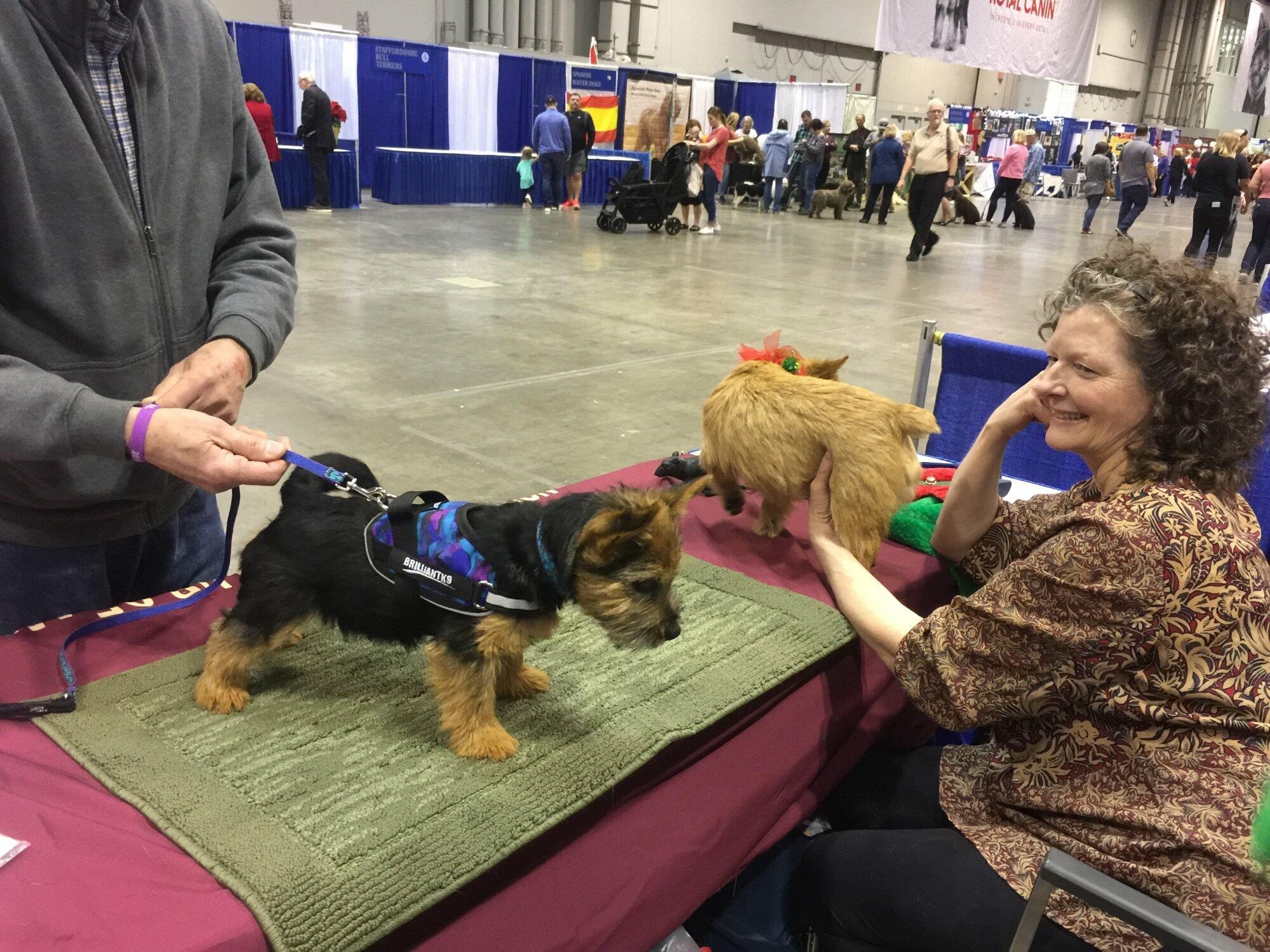 We had a terrific turnout for the Meet The Breeds event in Orlando, FL, held in conjunction with the AKC National Championship Show, December 16-17th. Members Melanie Bryson and Cathy Rogers set up our booth on Thursday, and stayed late to take it all down on Sunday. Cathy, myself, member Kelly Wood and Norwich owner Carol Jeffrey brought our youngsters and oldsters to meet and greet the public, and member Ellen Lucas was there to help when the humans needed a break. Our fabulous Noragility team members Melanie Bryson, Ursula Walsh and Rainee Johnson stopped by with their dogs to join the fun, as did members Marie Cato and Suzanne Bennett. Kelly and Melanie took many wonderful photos, which illustrate how well our breed can do in this stressful yet fun event.