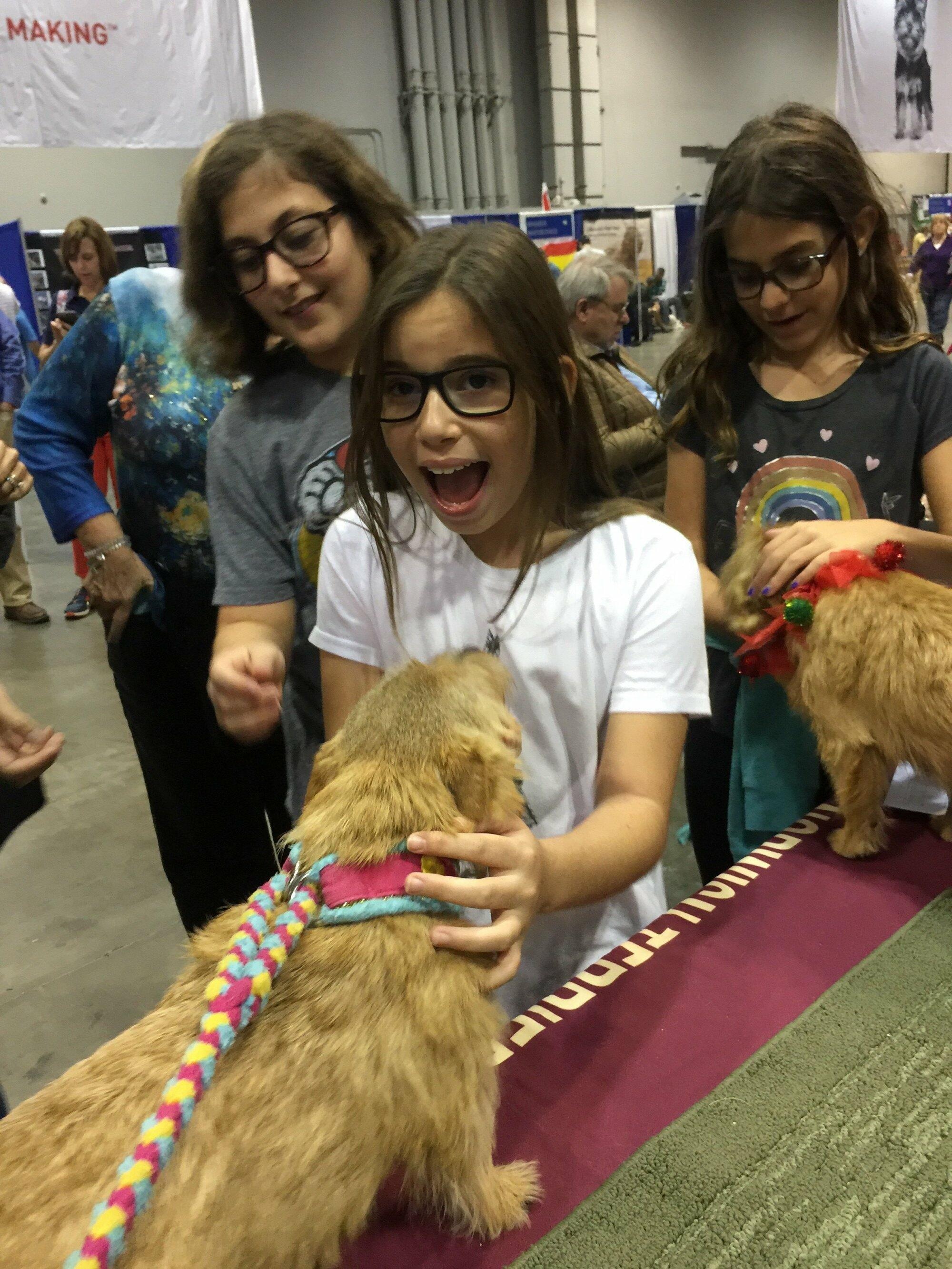 One of the best Meet the Breeds to date! The AKC held the event at the Jacob Javits Center in Manhattan, separate from the Westminster KC show due to pier repairs. The Javits has been renovated since our last experience there, and its wide aisles and overhead lighting made it more spacious and easier to maneuver. It also returned to a two-day format,which was a bit of a challenge, but our canine and human volunteers prevailed. I think all of our dogs thought the huge crowds came just to see them!!